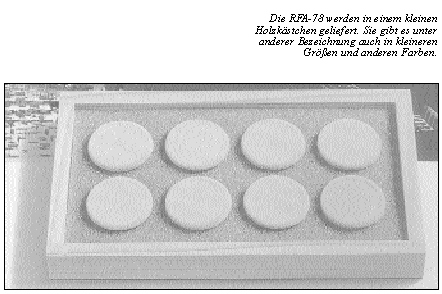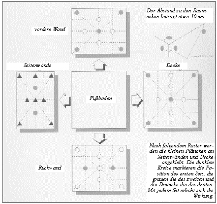 Das Aufbringen der kleinen Plättchen ist recht einfach und erfolgt nach einem Überkreuzsystem. Da selbstklebend, sind sie einfach wieder zu entfernen und können nach Gebrauch auch woanders ihren Dienst verrichten. Bis zu 48 Stück können nach einem bestimmten Raster aufgebracht werden, was die Wirkung weiter steigern soll, letztlich aber auch eine Kostenfrage ist. Mit rund 1.200 DM für ein Set (= 16 Stück) liegt der Preis hoch und wirft kritische Fragen bezüglich des bescheidenen Materialaufwands auf.