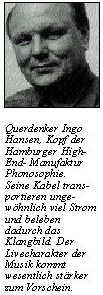 Und für die ganze Schar der Kritiker: Natürlich ist Ingo Hansen in einem hohen Maße eigenwillig. Aber verdanken wir - nicht nur in der Hifi-Szene - gerade diesem Typus Mensch die wichtigsten Anregungen und Erkenntnisse. Ihr Durchhaltevermögen unter Mißachtung aller existentieller Gefahren hat viele Wendepunkte herbeigeführt. Sie glauben daran, womit sie sich beschäftigen. Und das selbst in Zeiten, in denen sie ungerechterweise eher verkannt werden. Dazu fällt mir zum Schluß noch ein: Irgendwann einmal soll die Erde doch auch eine Scheibe gewesen sein ...MK